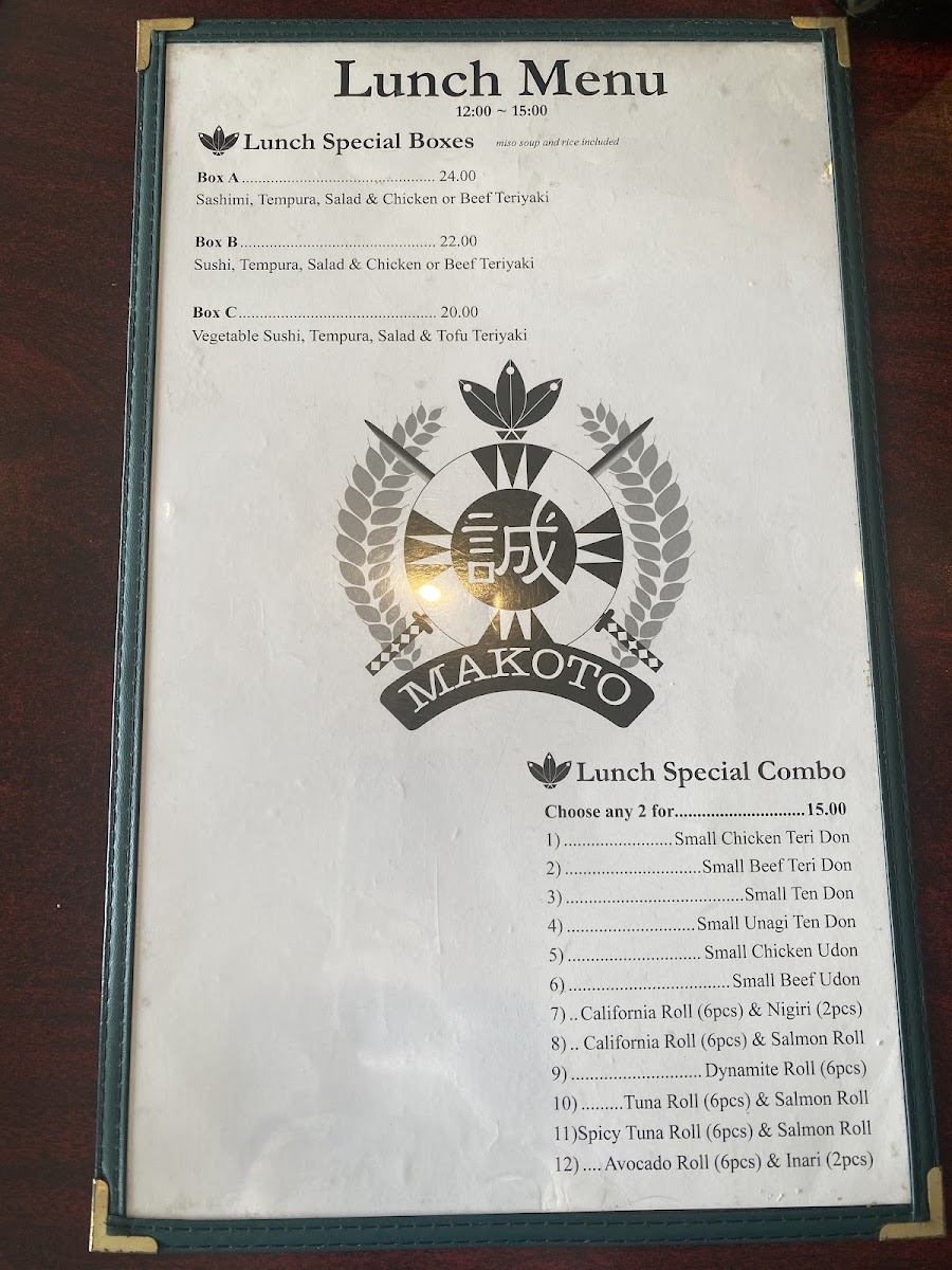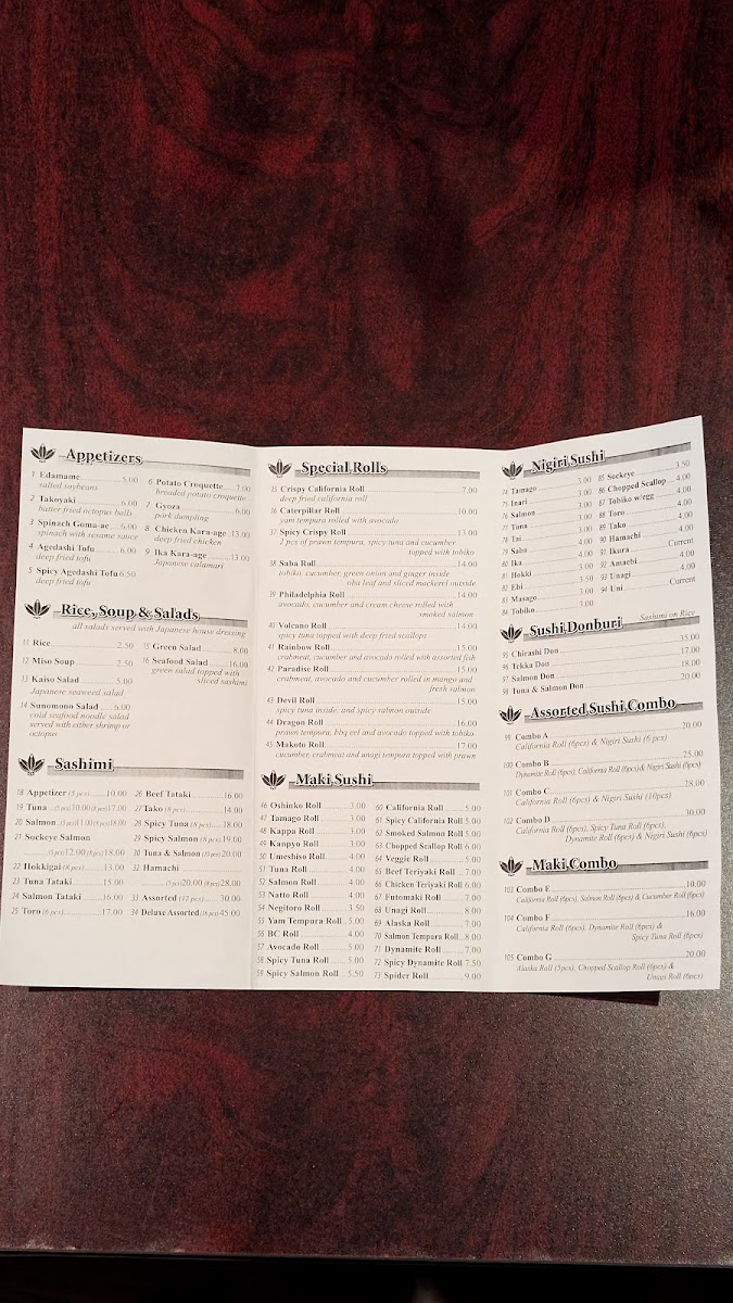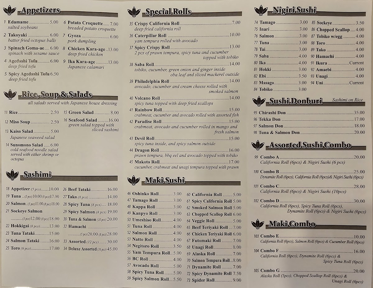 The menu at Makoto Japanese Restaurant offers a wide variety of traditional and creative Japanese dishes. For appetizers, diners can enjoy classic options like Edamame, Gyoza, and Takoyaki, with the Chicken Kara-Age and Spinach Goma-Ae providing a deliciously different choice. The sashimi selection includes fresh options such as Tuna, Salmon, and Sockeye Salmon, alongside indulgent choices like Toro and Hokkigai. The Nigiri Sushi menu offers a range of flavors, with popular items like Tamago, Tobiko, and Tako. If you prefer rolls, the Oshinko Roll, Tamago Roll, and Kappa Roll offer a simple yet satisfying experience, while the Crispy California Roll and Caterpillar Roll bring more inventive flavors to the table. For those looking for heartier meals, the Chirashi Don and Tekka Don are standout sushi donburi dishes. The restaurant also features a variety of special rolls, including the Spicy Crispy Roll and Philadelphia Roll. If you're in the mood for a combo, the Combo A and Combo B are perfect for sampling a little bit of everything. The lunch special boxes, such as Box A, Box B, and Box C, are ideal for those looking for a quick yet satisfying meal. With a combination of fresh fish, tasty rolls, and classic Japanese favorites, Makoto’s menu provides a delightful culinary experience.