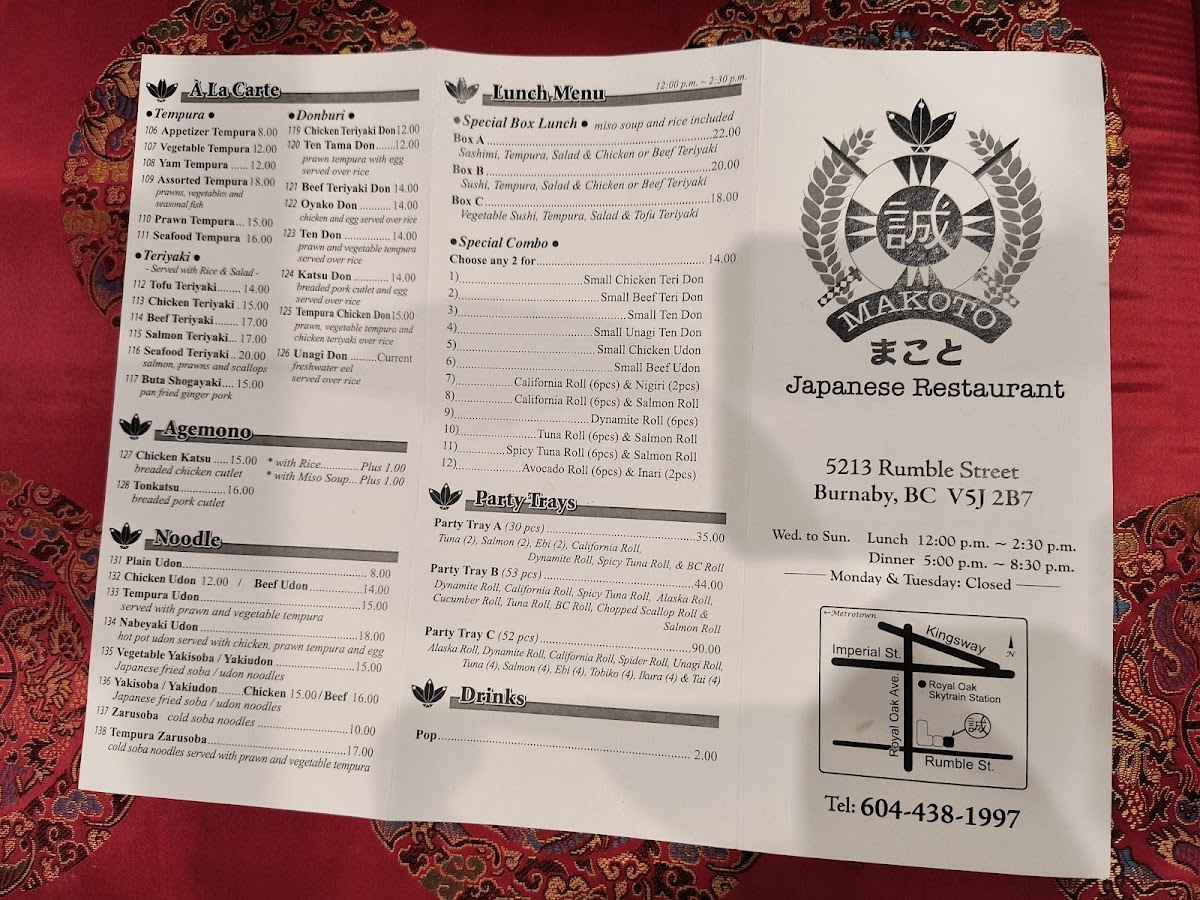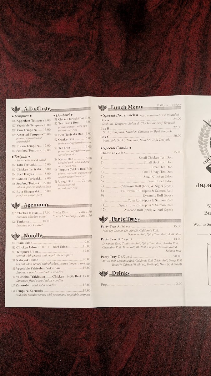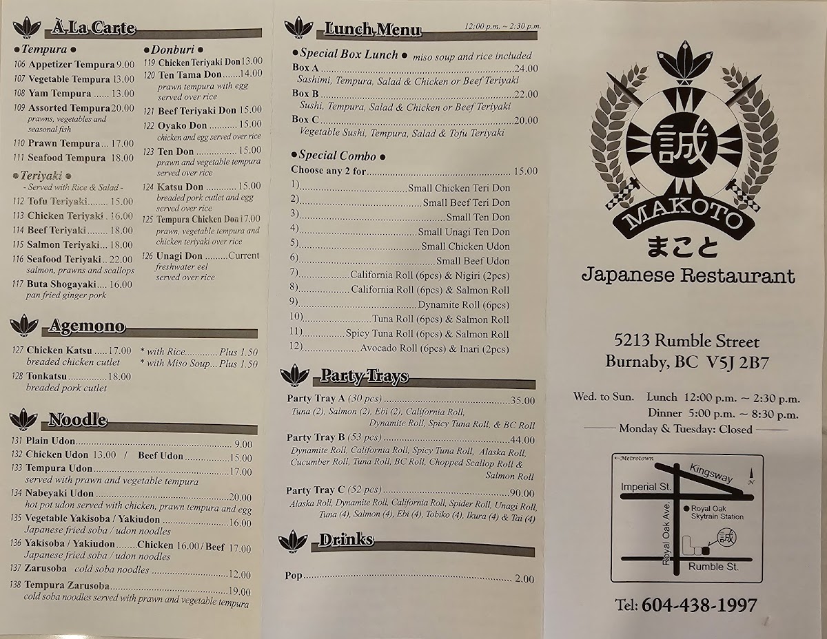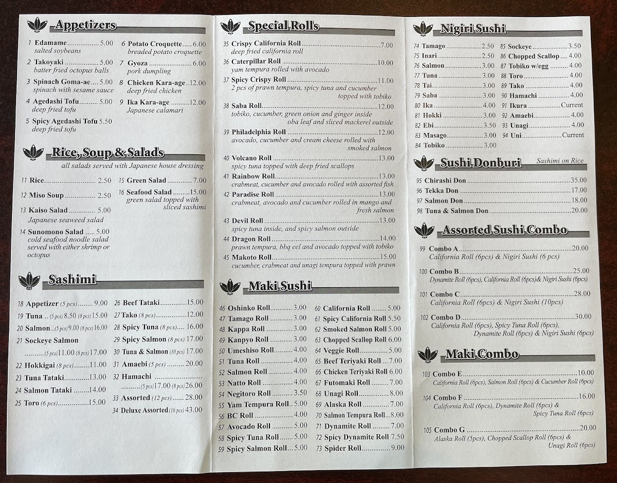 The menu at Makoto Japanese Restaurant offers a wide variety of traditional and creative Japanese dishes. For appetizers, diners can enjoy classic options like Edamame, Gyoza, and Takoyaki, with the Chicken Kara-Age and Spinach Goma-Ae providing a deliciously different choice. The sashimi selection includes fresh options such as Tuna, Salmon, and Sockeye Salmon, alongside indulgent choices like Toro and Hokkigai. The Nigiri Sushi menu offers a range of flavors, with popular items like Tamago, Tobiko, and Tako. If you prefer rolls, the Oshinko Roll, Tamago Roll, and Kappa Roll offer a simple yet satisfying experience, while the Crispy California Roll and Caterpillar Roll bring more inventive flavors to the table. For those looking for heartier meals, the Chirashi Don and Tekka Don are standout sushi donburi dishes. The restaurant also features a variety of special rolls, including the Spicy Crispy Roll and Philadelphia Roll. If you're in the mood for a combo, the Combo A and Combo B are perfect for sampling a little bit of everything. The lunch special boxes, such as Box A, Box B, and Box C, are ideal for those looking for a quick yet satisfying meal. With a combination of fresh fish, tasty rolls, and classic Japanese favorites, Makoto’s menu provides a delightful culinary experience.